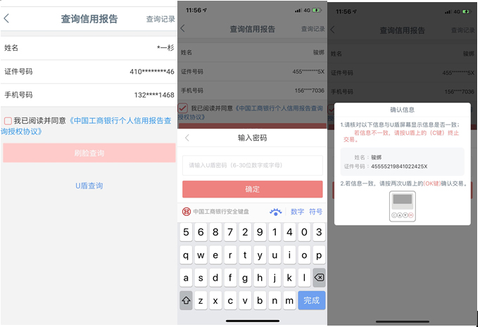 2、阅读并勾选协议后,点击“申请报告”,选择U盾查询或刷脸查询,按提示操作。(图片为U盾查询示意)