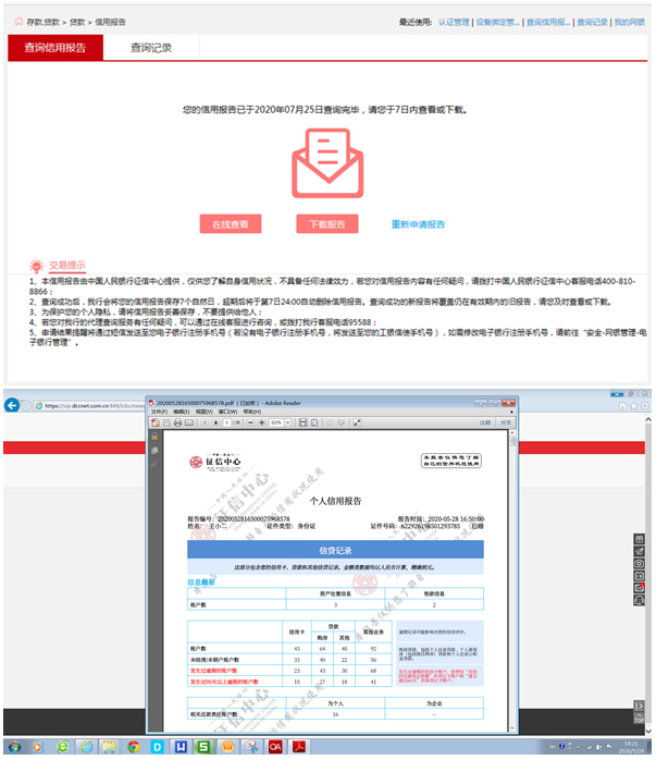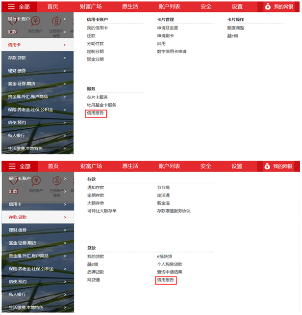 【方式二:网上银行】1、登陆网上银行,进入“全部-信用卡-服务-信用报告”,或“全部-存款.贷款-贷款-信用报告”