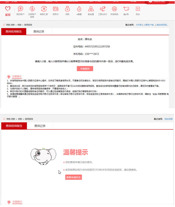 3、收到报告后,工行会第一时间发送短信或融e联消息通知您,进入“信用报告”功能,即可在线查询您的信用报告啦