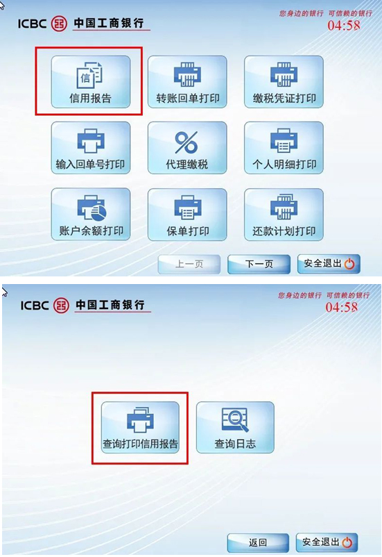 申请查询方法   ● 在工行网点智能柜员机上,按下图步骤申请报告。