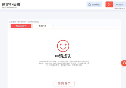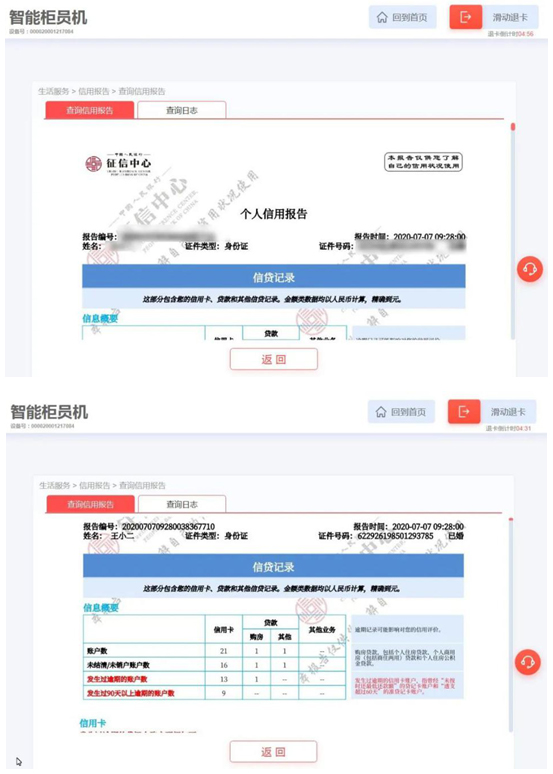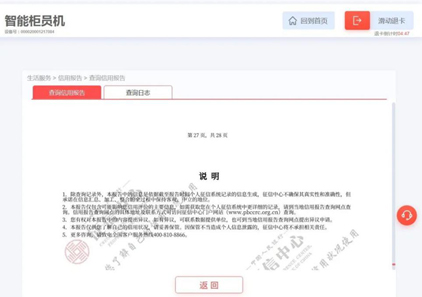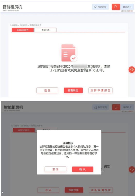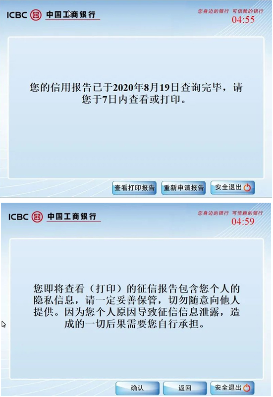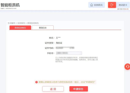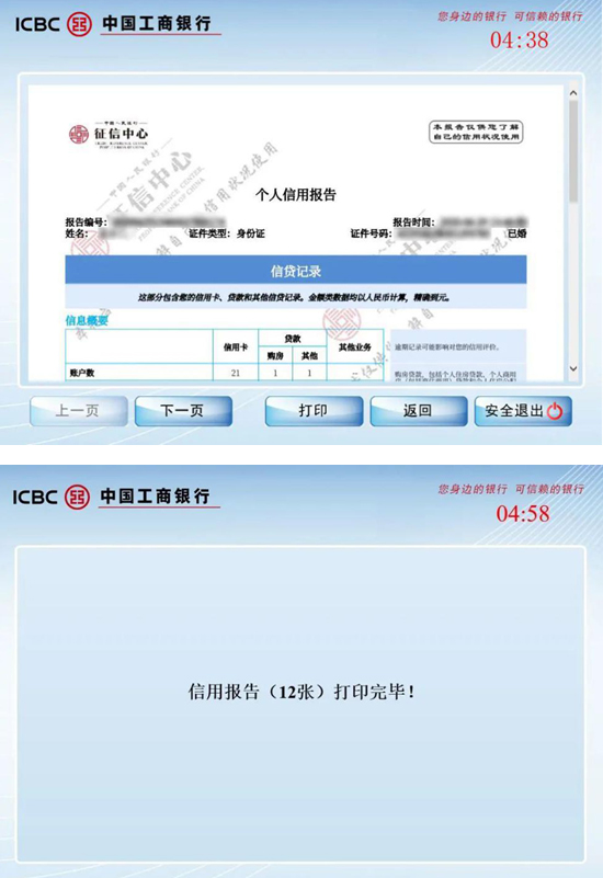 ● 如果您想打印报告,通过智能柜员机、智能打印机完成申请并收到信息提醒后,您可以到智能打印机上用同样方法验证身份,打印出纸质版信用报告。