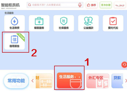 ● 征信中心从查询到反馈结果需要一定时间。收到报告后,工行会第一时间向您发送短信或融e联消息提醒。此后7天内,您可以到工行网点,再次通过智能柜员机菜单“生活服务-信用报告-查询信用报告”,按下图步骤查看信用报告。