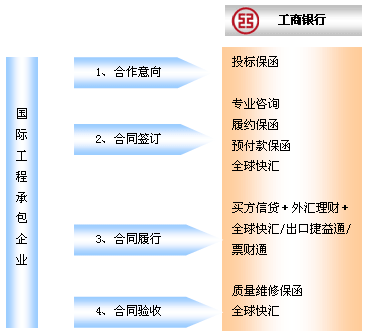 八、环球工程通 (投标保函+履约保函+预付款保函+质量维修保函+汇入汇款+买方信贷/出口捷益通/票财通) (一)业务简述: 如果贵公司在境外承包工程项目,工商银行的“环球工程通”可以在工程投标、合同签订、履行、验收等各个阶段为您提供包括结算、融资、理财在内的全流程专业配套服务。 简要流程图如下:
