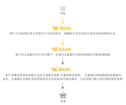 (2) 代理结售汇业务:作为国家外汇指定银行,工商银行可以为不具备业务资质的银行同业提供代理结售汇服务。工商银行每日公布的挂牌汇价中有14个外币币种可办理结、售汇业务。这些币种是:美元(USD)、港币(HKD)、日元(JPY)、欧元(EUR)、英镑(GBP)、瑞士法郎(CHF)、加拿大元(CAD)、澳大利亚元(AUD)、新加坡元(SGD)、丹麦克郎(DKK)、挪威克郎(NOK)、瑞典克郎(SEK)、澳门元(MOP)、新西兰元(NZD)。工商银行对外挂牌的外汇牌价包括五种标价,即:外汇中间价、外汇买入价(银行现汇结汇价)、外汇卖出价(银行现汇售汇价)、外汇现钞买入价(银行现钞结汇价)、外汇现钞卖出价(银行现钞售汇价)。 (3) 代客外汇理财:工商银行代客外汇理财业务的主要工具是各类外汇结构性存款,即在普通外汇存款的基础上,将存款的最终收益与一个或多个金融产品的价格表现挂钩,以提供高于一般定期存款的利率。协议挂钩的金融产品可以是汇率、利率、股票、指数、商品及债券等等。