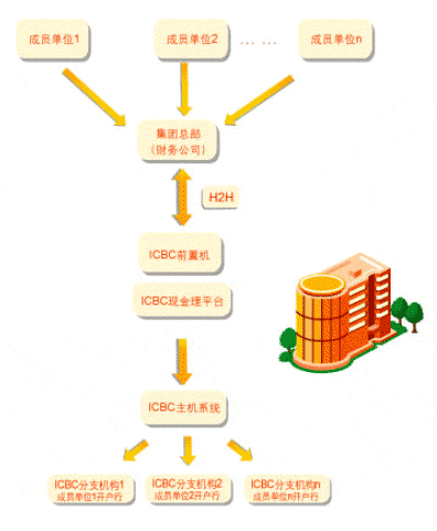 现金管理解决方案 1、银企互联解决方案 基于客户银企账务同步处理的需求,现金管理服务方案首先考虑为财务公司与银行间建立银企互联的服务架构,实现将财务公司账户与银行账户建立一一对应关系,在财务公司系统完成账务处理的同时进行银行业务的同步处理。