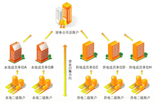 2、资金归集解决方案 为财务公司总账户与成员企业账户建立集团二级账户结构,实现各成员单位二级账户资金实时归集到财务公司总账户,且成员单位资金余额及明细记录不受归集影响。