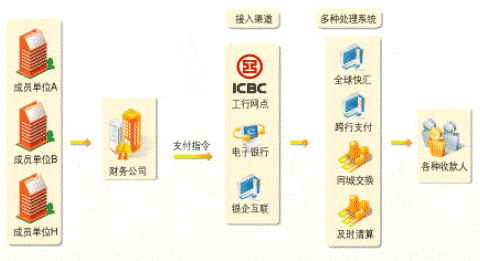 3、集中支付解决方案 建立银企互联系统和集团二级账户组织结构后,财务公司可办理成员单位的集中对外支付,财务公司汇总所有支付指令,通过银企互联系统提交给银行进行处理。