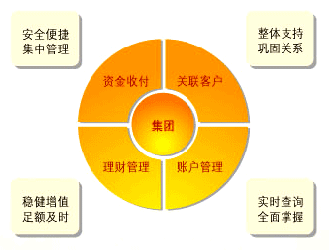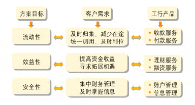 现金管理解决方案 针对客户需求,工商银行充分运用丰富的金融产品和技术优势,提供优质高效的收付款产品、积极与稳健并重的理财服务、及时充足的融资保障以及全面准确的账务信息。使客户资金流、信息流伴随物流安全、顺畅流动,协助企业实现资金管理流动性、安全性、效益性的总体目标。 工商银行在银企直联、收付款、资金归集、供应链、理财等五个方面为客户量身定做了综合化的服务方案,提供个性化的专家服务。