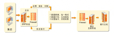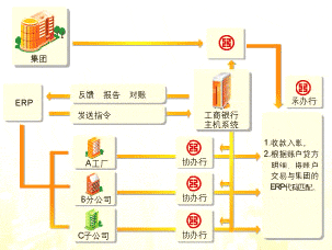2、银企直联解决方案 针对集团集中管理、控制支付的需求,工商银行设计了收支两条线的集团账户架构,集团总部账户与各成员单位之间账户建立了联动的控制关系,通过银企互联方式,建立了集团ERP系统与工商银行系统的联接,集团总部财务人员可以通过ERP系统进行账户查询、资金归集、下拨和其他特定服务,实现了总部对成员单位资金和信息的集中控制。