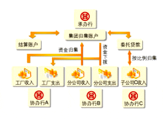 4、资金归集解决方案 针对集团及时归集资金的需求,工商银行为集团设计了基于银企互联系统的解决方案。总部财务人员按需要设置资金归集时间和方式,每日将成员单位资金归集至集团总部。对无财务控制权的销售公司的资金归集问题,工商银行通过设置委托贷款方式予以解决。