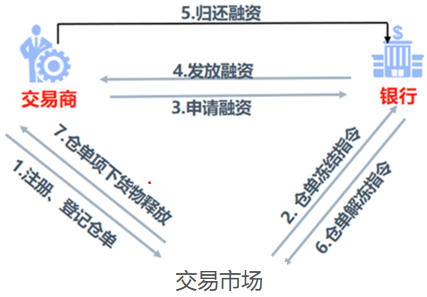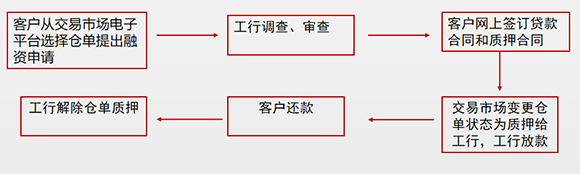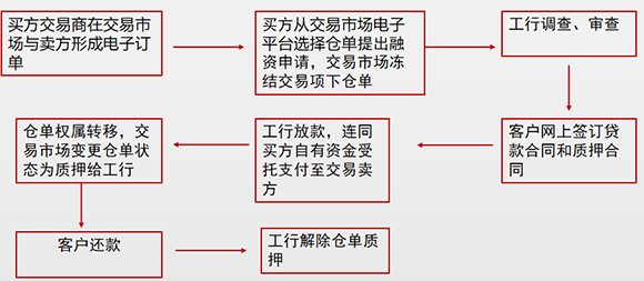 一、业务简述 “数字供应链融资”是指在智慧联数据对接规范下,在科技赋能,商流、物流和资金流合一基础上,由场景和交易数据驱动系统智能决策,为供应链各环节客户在线提供的贸易融资服务。 数字供应链包括垂直链、交易链和数据链三个场景: 交易链是指以网上商品交易平台为场景,买卖方交易商以电子仓单(含标准仓单)为交易标的物,进行信息发布、商品交易、物流交割、货款清算活动的贸易链。该场景下,我行与网上商品交易市场等机构合作,以交易商品现货作为保障,为交易商提供在线申贷、智能提还款服务等短期融资业务。 二、开办条件 在与工行合作的网上商品交易市场上经营的交易商。 三、特色优势 1. 操作便捷:贷款申请、合同签订和还款全网络操作,减少纸质材料的传递和往来银行之奔波; 2. 融资高效:银行借助交易商网络数据进行评判,贷款审批更为高效,让交易商在第一时间拿贷款,提还款解押便捷; 3. 功能齐全:满足仓单融资、订单融资多种需求,提供贷款申请进度查询和及时的短信提醒功能。 四、业务示例 交易市场上客户数量众多,企业分布在全国各地,融资需求“短频急”。为分布在全国各地的交易商带去全流程线上化“无地域、无时差”的业务体验。