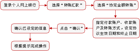 名词解释 1. 协定金额转入:客户预先约定某一指定账户始终保持一个余额水平,当客户指定账户可用余额小于约定金额时,银行自动从客户指定的转出账户中转出指定金额补足到该指定账户。 2. 协定金额转出:为了确保客户某一指定账户中有超过预定金额的多余资金可以转到其他账户另作它用,以获取更大的效益。当客户指定账户可用余额超过约定金额时,银行自动从该指定账户(转出账户)中转出一笔资金(转出固定金额或转出后保留一定金额)到另一指定账户(转入账户)。